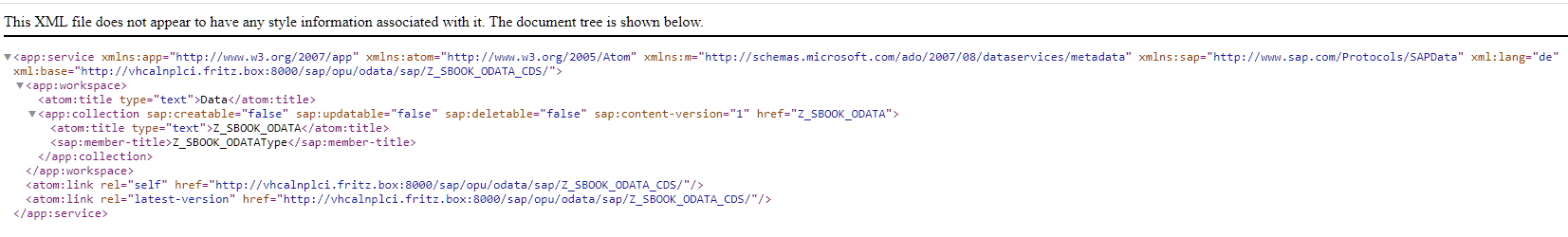 The successful activation of the service can also be tested with the browser. The metadata of the oData service is displayed.